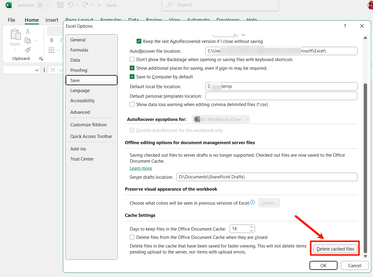 - Open Excel and go to File > Options > Save > Click on Delete cached files.