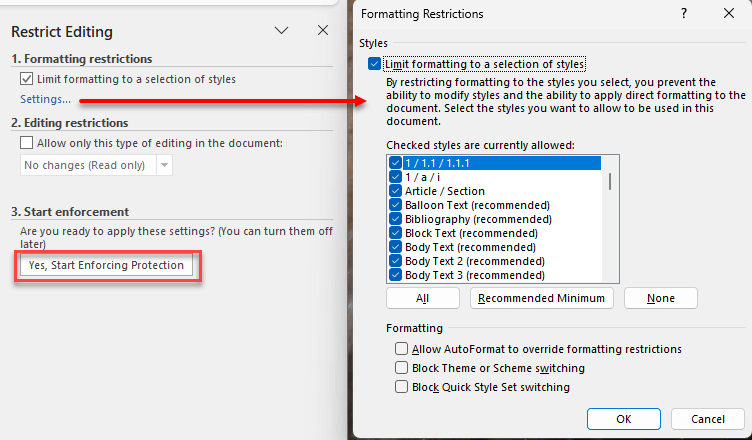 Check the box under "Formatting restrictions" and click the Settings link to open the dialog box on the right side.