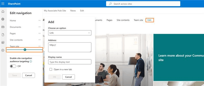 On the other hand, I followed these steps to add the link: Open the communication hub site, click the Edit button in the top menu bar, then click the plus (+) sign on the left sidebar. This will open a window to input information. Copy the Teams site URL from the browser and paste it into the address input section. In the Display Name field, I entered "Team Site." After saving, I can see the link on the menu bar.