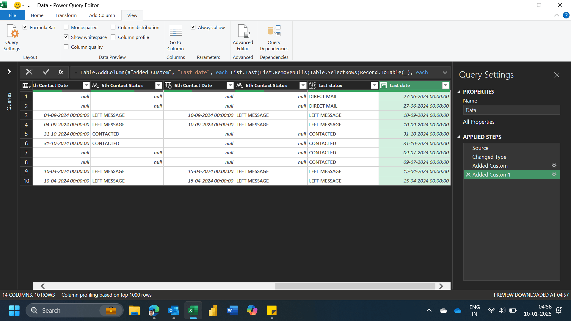 #"Changed Type" = Table.TransformColumnTypes(Source,{{"1st Contact Date", type date}, {"2nd Contact Date", type date}, {"3rd Contact Date", type date}, {"4th Contact Date", type date}, {"5th Contact Date", type date}, {"6th Contact Date", type date}}),
