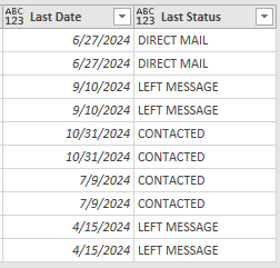 #"Expanded {0}" = Table.ExpandRecordColumn(#"Added Custom", "Last", {"Last Date", "Last Status"}, {"Last Date", "Last Status"})