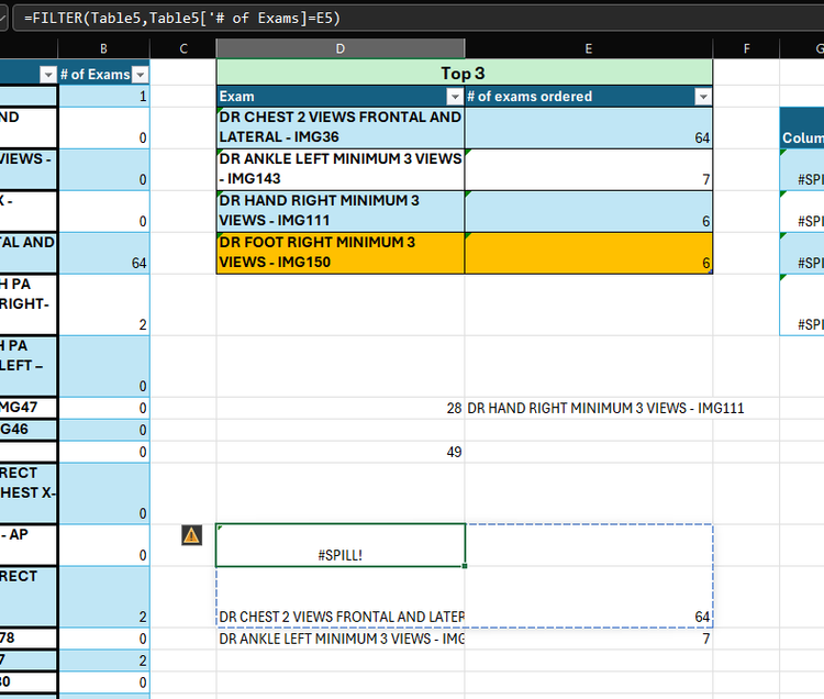However I did try =FILTER(Table5,Table5['# of Exams]=E3), but if the data set is more then 3 rows, then It says Spill and It's the same problem as above, I need it to automatically add rows so that all my results can be shown.