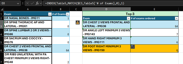Hi, I am trying to create a table that is basically showing the top 3 results from a another table with 2 columns. However, I've been running into an issue when the values are the same, as it is only returning the first result. I need this table to automatically update monthly when I Change the data in the main table, so my top 3 results may change to more than 3 rows (like say there is two ties, one for first and two for third totaling 5 rows). Is this possible to do using the current formula I have been using, INDEX MATCH, or is there a different formula? I tried the FILTER function, and that returns the correct values, however I can't make it into a table. Ideally I'd like to keep my table, but if it's not possible then I will have to change it to a range. I really need this function to work, as It will be time consuming to go through the data to see if there is any tie breakers and have to manually update my top 3 results. I have figured out how to show the second result in a tie breaker, but as I've said above, I need this to automatically add or delete rows from my top 3 results table when the main data is changed, so if I'm showing the results for the top 3, I don't have to go through my main data to find a tie breaker and then have to manually add those rows to the table. The formula I have in D3 is =INDEX(Table5,MATCH($E3,Table5['# of Exams],0),1) and the only thing that changes for D4 &D5 is the row number in my match formula, so $E4 & $E5.