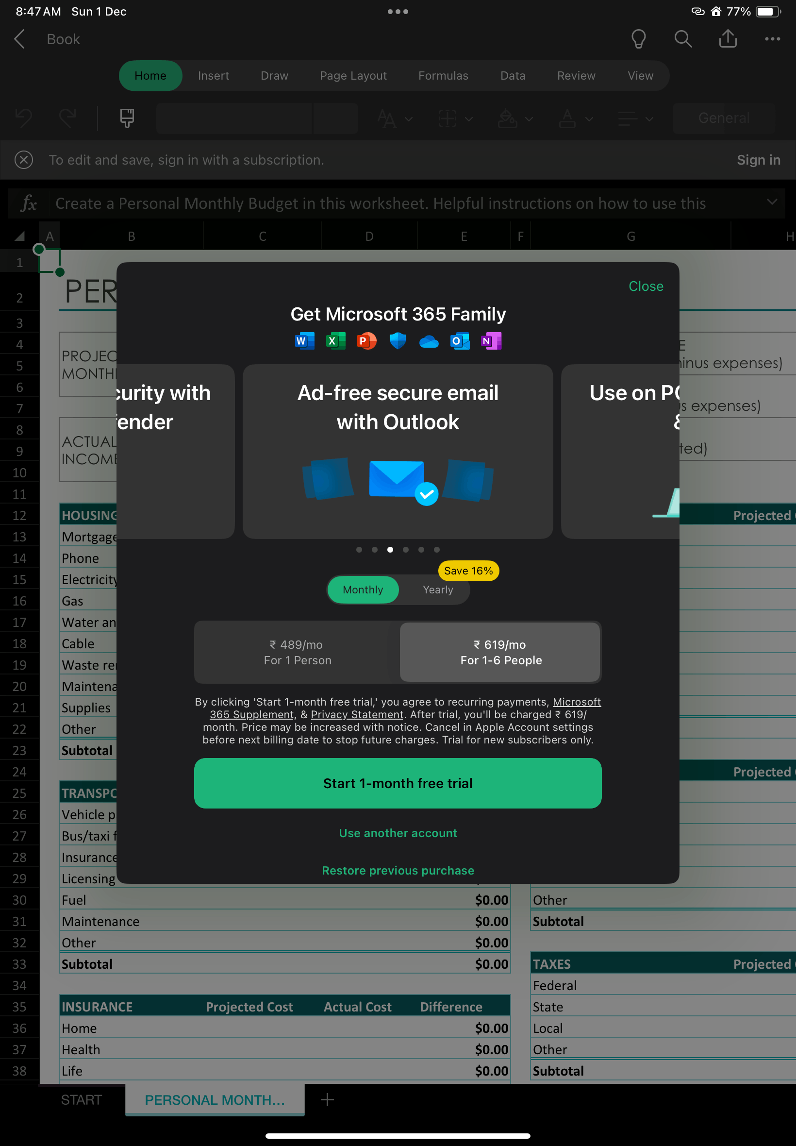 Hello MageshkumarMuniyappa, Welcome to the Microsoft community.Have you always been able to use Office on your iPad for free between you?Normally, you need to have an Office product to log in to your Office account in order to use Office properly.Have you replaced your iPad? Some screen sizes allow you to edit documents without a Microsoft 365 subscription, for more information you can refer to the link below. What you can do in the Microsoft 365 apps on mobile devices with a Microsoft 365 subscription - Microsoft Support If you have not purchased any Office products, I recommend purchasing a Microsoft 365 subscription in order for you to use Office properly. Buy Microsoft 365 Family & Personal Subscriptions, and Office 2024 - Microsoft Store You may also consider using the free web version of Office through your browser. Excel | Microsoft 365SincerelyCarlos - MSFT | Microsoft Community Support Specialisto