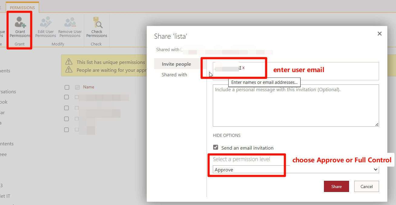 Users with either “Approve” permission or “Full Control” permission can approve items in a SharePoint list. To assign these permissions to specific users: