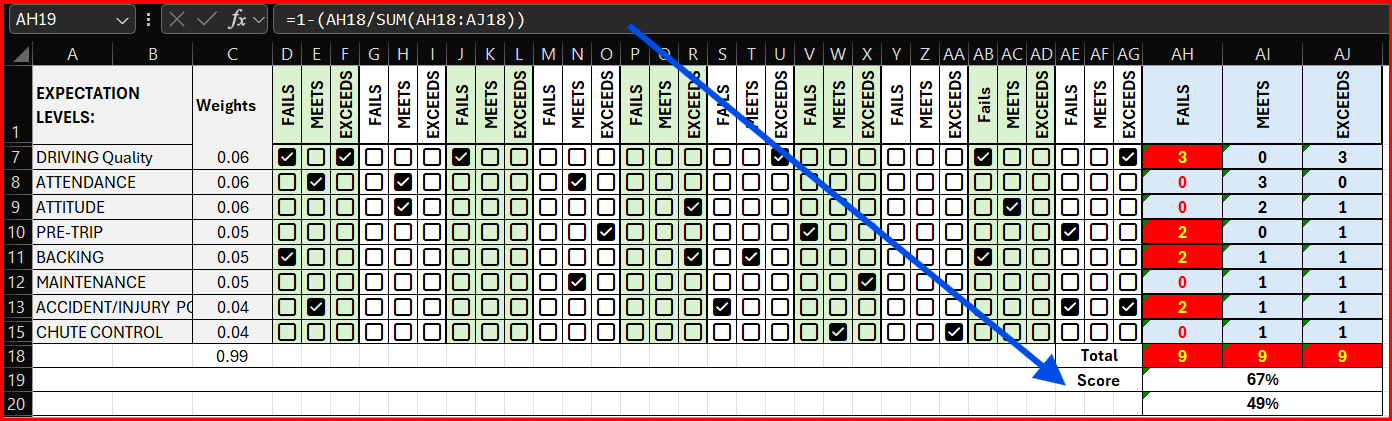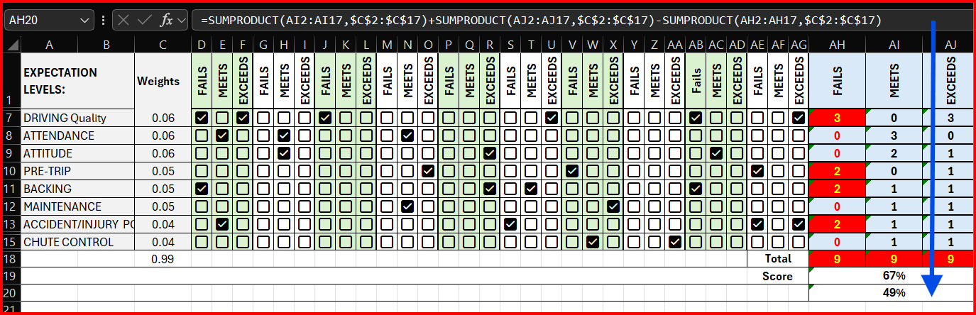 =(SUMPRODUCT(AI...) + SUMPRODUCT(AJ...)*2-SUMPRODUCT(AH...)*3)+9)(6+9) formatted for percent (the +9 is because we need to subtract a -9, the lowest score).