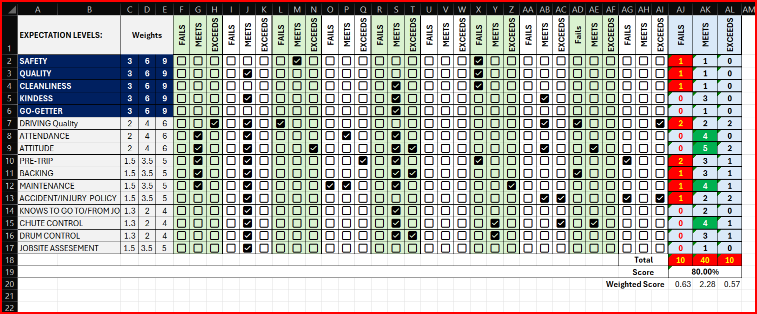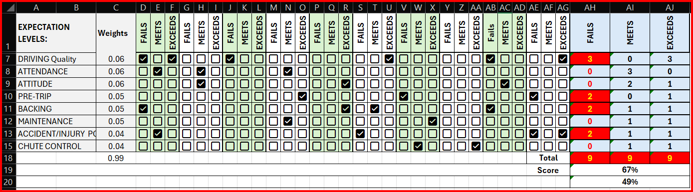 Then, what is the worst case? That could be 3 Fails for each category, so the worst score would be -9 (including the weights).