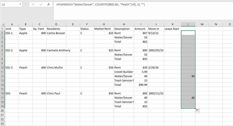 =IF(AND(H2="Water/Sewer", COUNTIF($B$1:B1, "Peach")>0), I2, "")