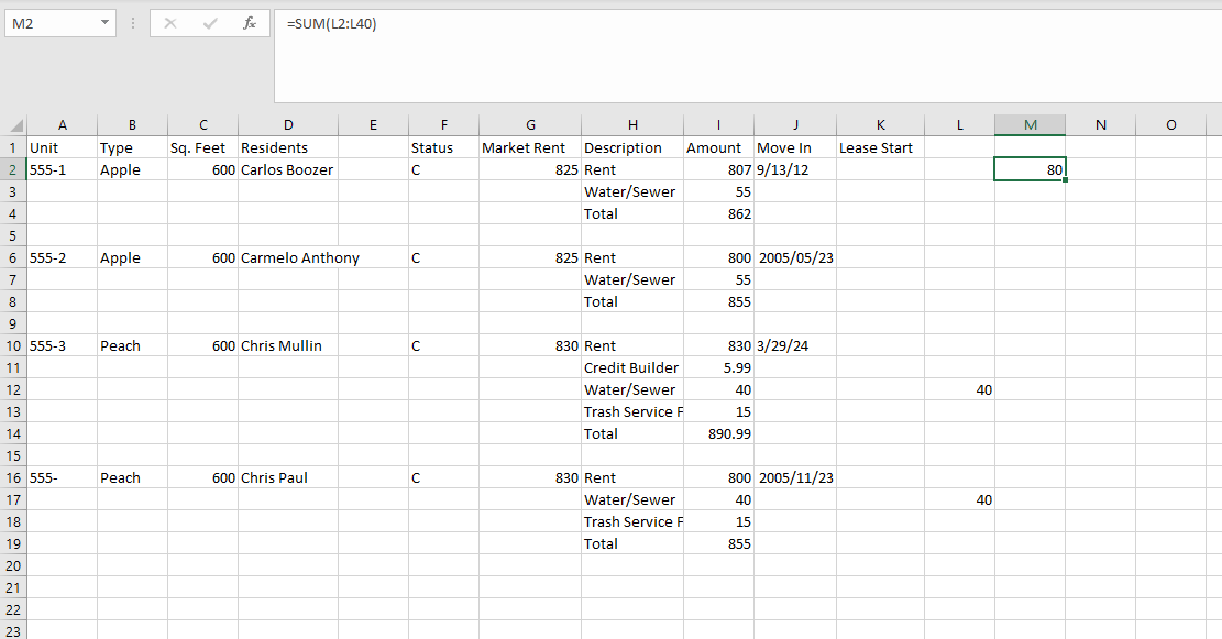 Was thinking about using index/match to make a new column with the amounts but sometimes the label "Water/Sewer" doesn't appear for some units so it will mistakenly take it from the next unit down. Any ideas are appreciated, let me know if the explanation isn't clear. Thank you.