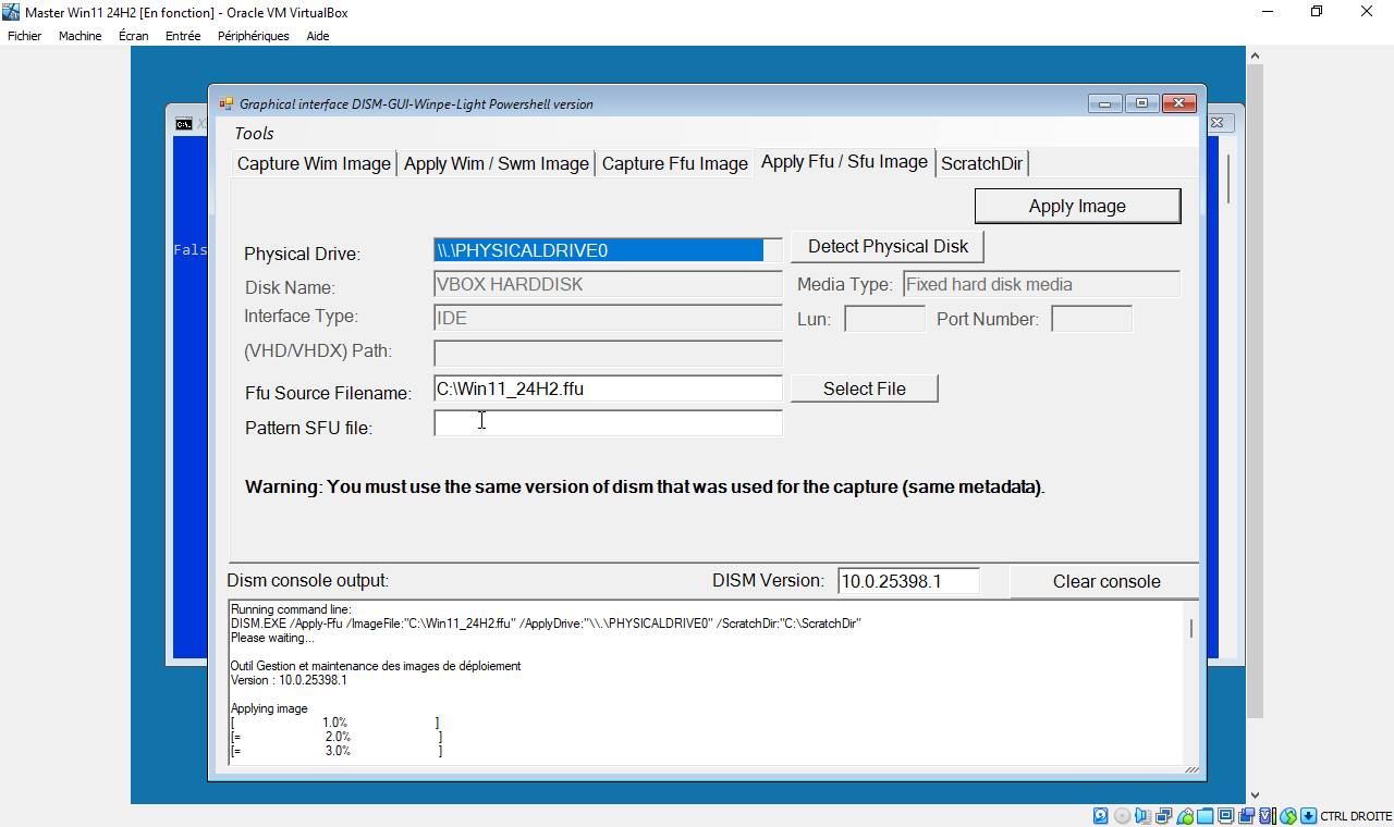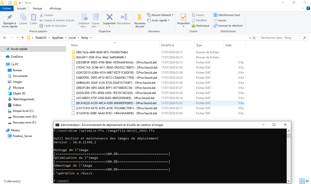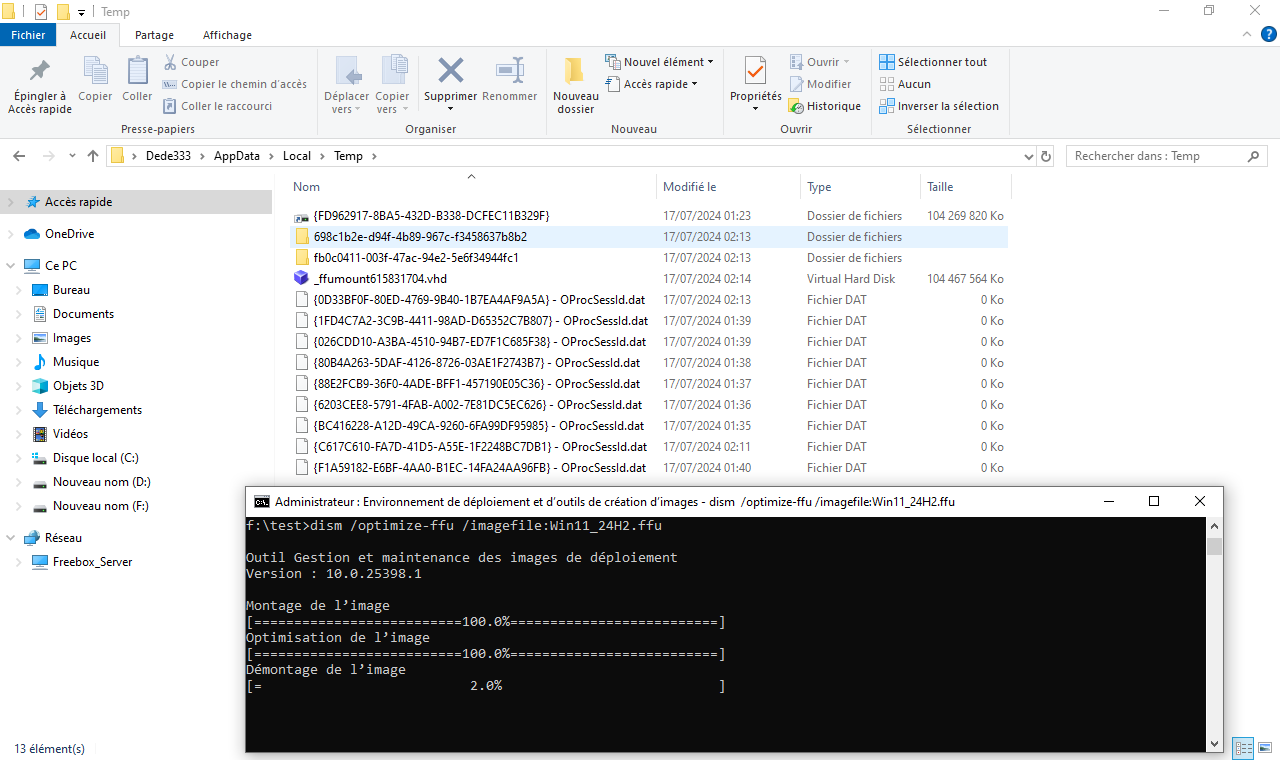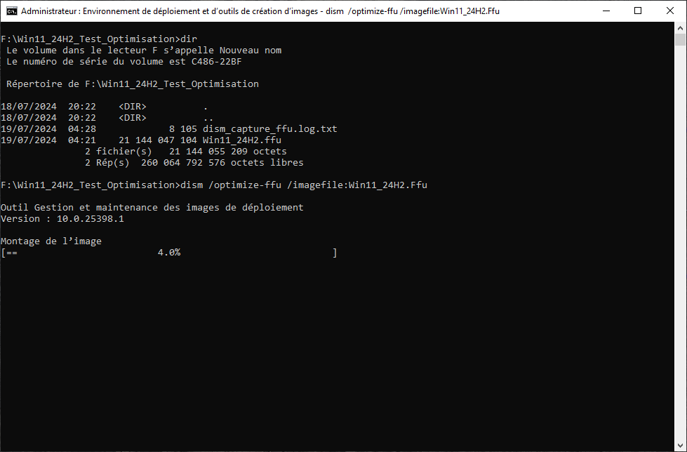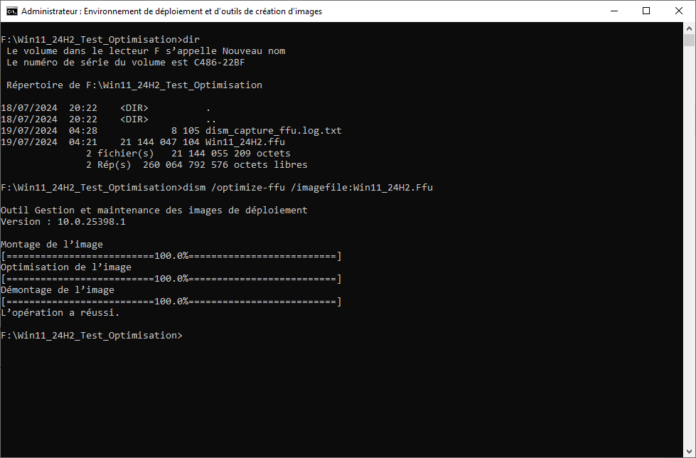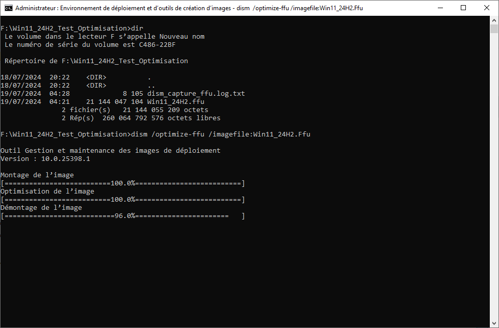 However, anything with a small drive won't work so I ran the 'Optimize-FFU' command from the Deployment and Imaging Tools command prompt on my server which hosts the network share and that process went through successfully. My understanding is that this modifies the image so that it will work on small drive sizes.