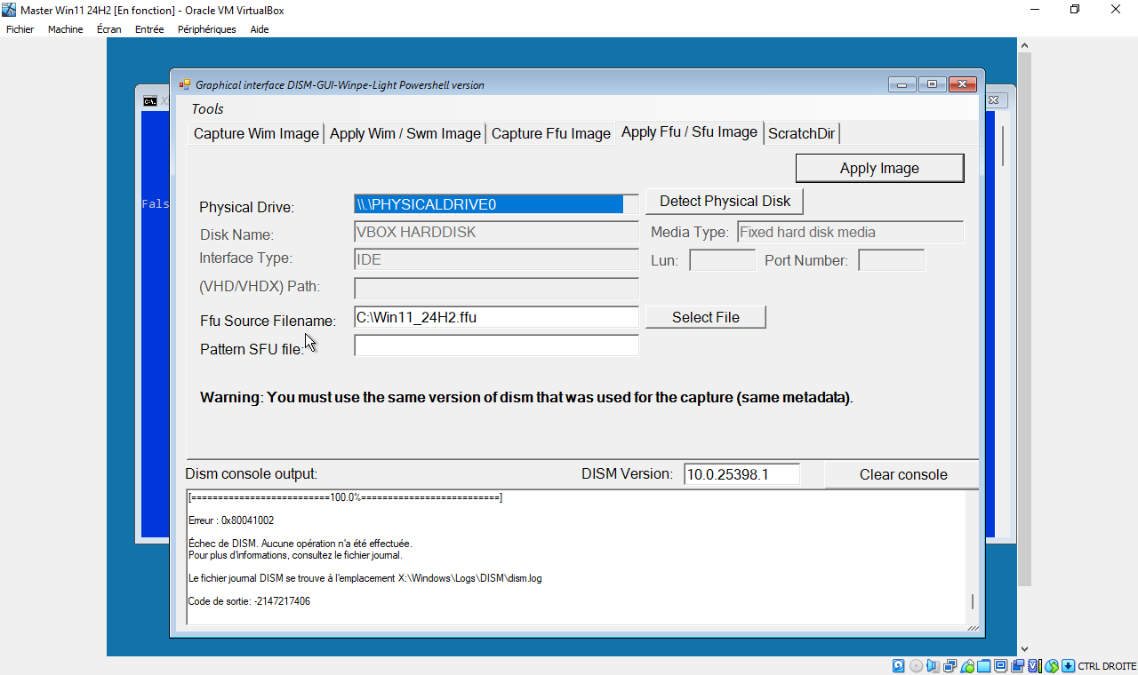 2021-09-05 13:56:55, Error DISM DISM FFU Provider: PID=1488 TID=1464 Failed to apply an FFU image to '\\.\PhysicalDrive0'. - CFfuManager::InternalCmdApply(hr:0x8000ffff)