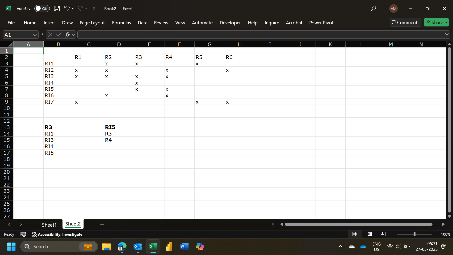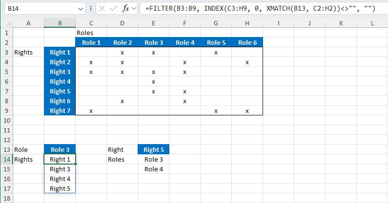 I want to be able to select one of the ROLES from a dropdown menu on another sheet in the same workbook and have Excel generate a list of which RIGHTS this role should have. It would also be very convenient if we can do this the other way around. (Meaning: Selecting one of the RIGHTS to get a list of the ROLES that have this right.)