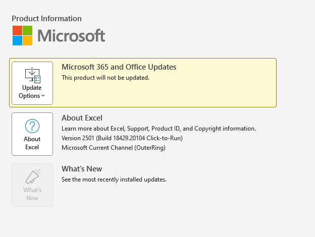 - The screenshots of version information of Excel you are using (File - Account - version information)