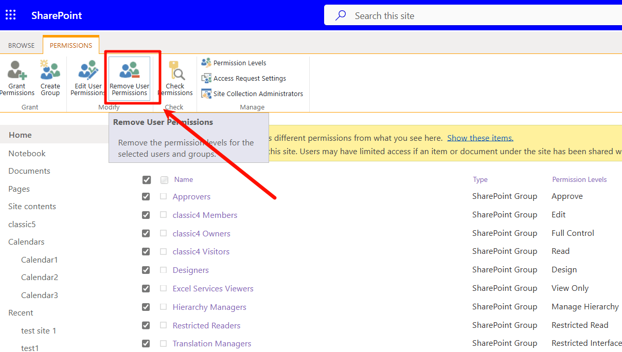 - Use SharePoint Permissions: Navigate to the site > Click on “Settings” >> “Site Permissions” and then “Advanced permissions settings.” > Remove all users and groups permissions from this page and manually grant permission to the specific group of users.