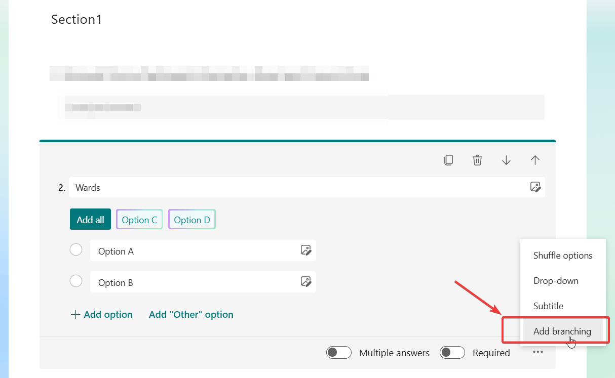 - Apply Branching Logic: Click on the three dots (…) next to the ward question. Select Add branching and set it so that choosing a ward directs users to the duration and medication questions.