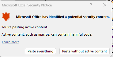 Why do Excel start giving this error when I input formula: Microsoft Office has identified a potential security concern. You're pasting active content. Active content, such as macros, can contain harmful code. How can I proceed to use my formula on Excel. I am using MS 365
