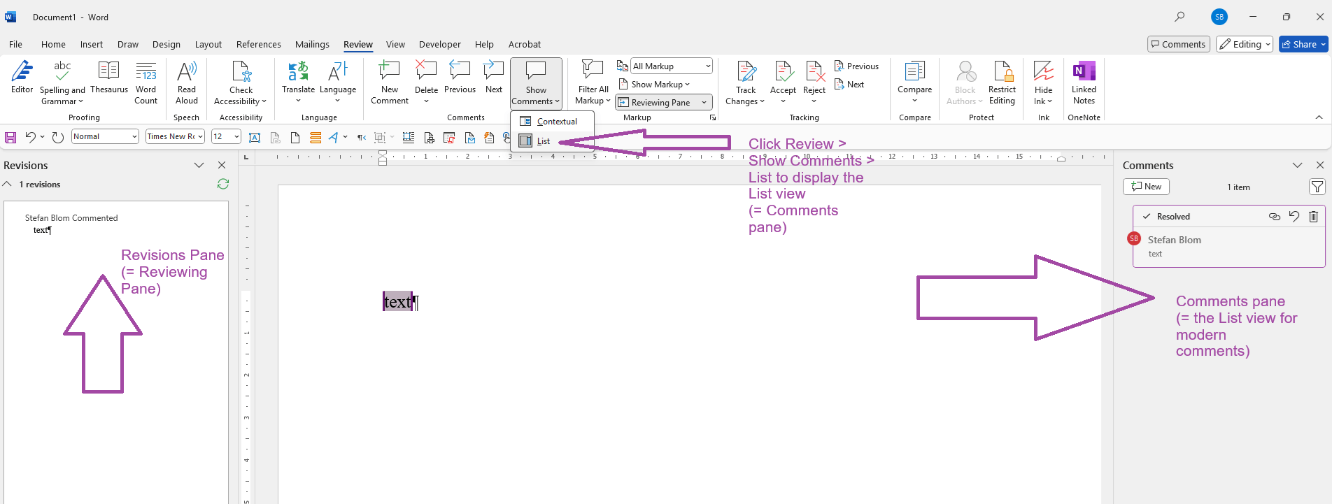 If your version of Word is using the so-called modern comments, Resolved comments will also be shown in the List view (not the Contextual view). On the Review tab, click Show Comments (in the Comments group) and then click List. The List view means that Word shows the Comments pane (on the far right of the document by default).