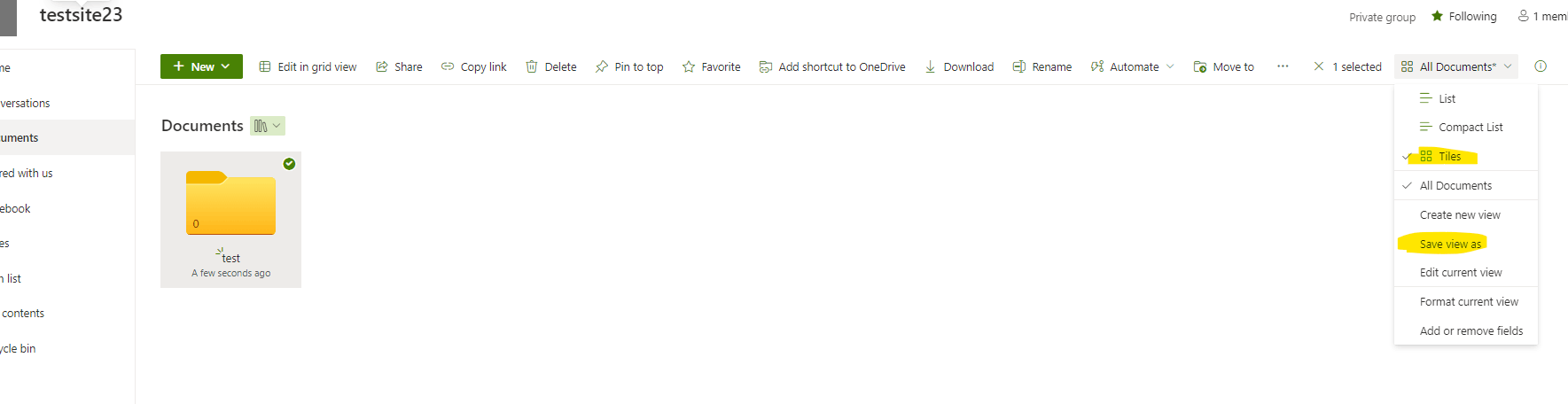 However, you can set/ change the List view to Tiles as default in a SharePoint online document library(not a Folder Level). via in your document library, click on the "Tiles" link and then again click on the "Save view as" which will open a popup.