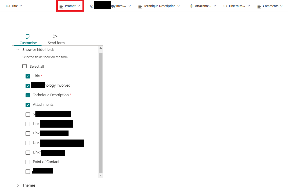 I have a list of columns in a SharePoint list and I want to start using the new Forms feature to allow users to submit data that will go into this SharePoint list. However, not all of the fields I want to show in the form are available in the "Show or Hide Fields" section under Customise when I set up the form. The field type is 'Multiple Lines of Text' and there are other fields of that same type that do show as options for me so I do not believe the field type limitations apply here. Is there a numerical limit to how many fields can show on a form, and if so how do I remove the options from the Show or Hide Fields section that I won't be using?