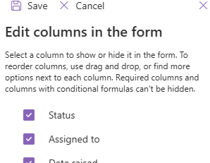 I have a list of columns in a SharePoint list and I want to start using the new Forms feature to allow users to submit data that will go into this SharePoint list. However, not all of the fields I want to show in the form are available in the "Show or Hide Fields" section under Customise when I set up the form. The field type is 'Multiple Lines of Text' and there are other fields of that same type that do show as options for me so I do not believe the field type limitations apply here. Is there a numerical limit to how many fields can show on a form, and if so how do I remove the options from the Show or Hide Fields section that I won't be using?