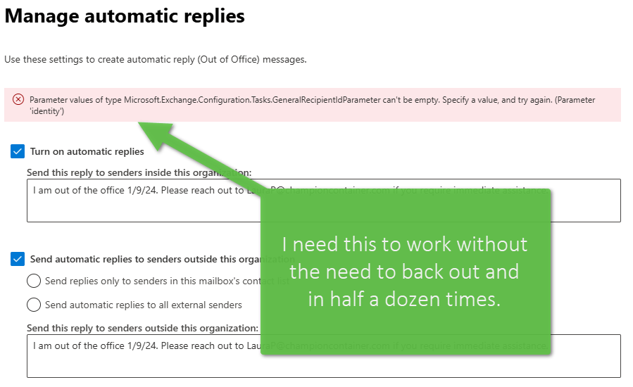 Based on the behavior described, this issue appears to be related to how the system processes the identity parameter when setting Out of Office (OOO) across multiple mailboxes. Since multiple administrators are experiencing this across different machines and browsers, it suggests a backend issue rather than a local device or browser-related problem.