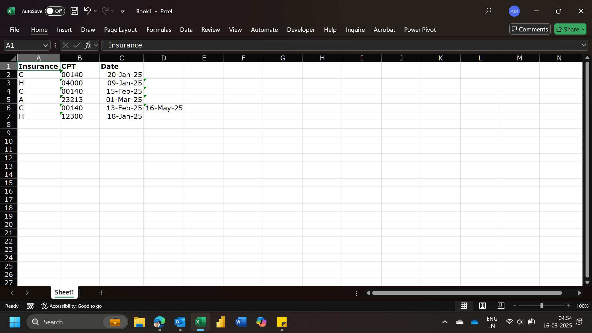 Row 2 lists ABC Insurance and CPT code 12345 with a date of 1/1/2025.