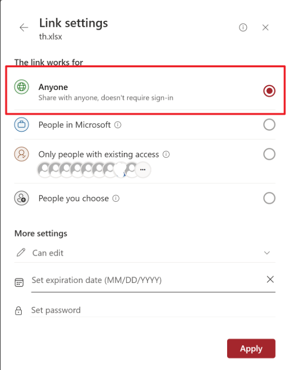 Also, try sharing the file as an "Anyone with the link" link, and test if the user can edit it and save changes to SharePoint. ( If you are unable to see the "Anyone link," please refer to this article.--- >>> Sharepoint "anyone" share link greyed out, even after ...)