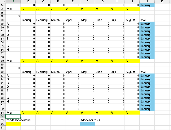 Both of these formulas will result in #N/A if there is no data in the Row/Column. That is good. The MODE formulas will replace those with "" so that they will not be counted.