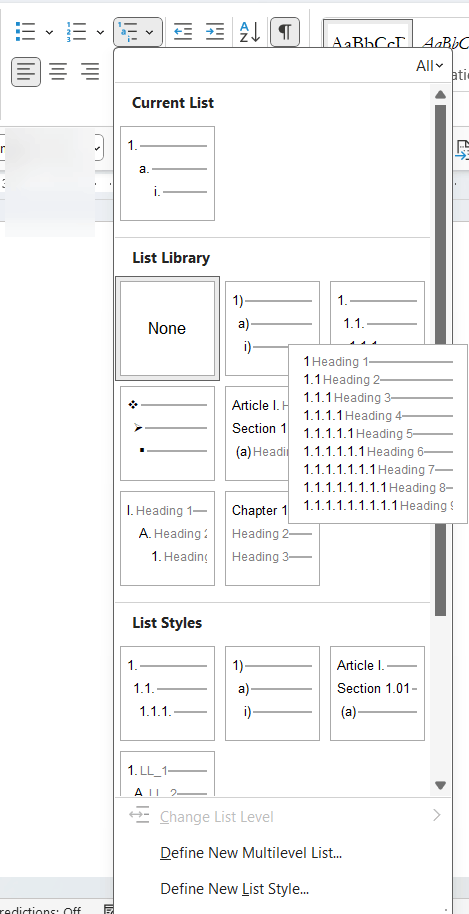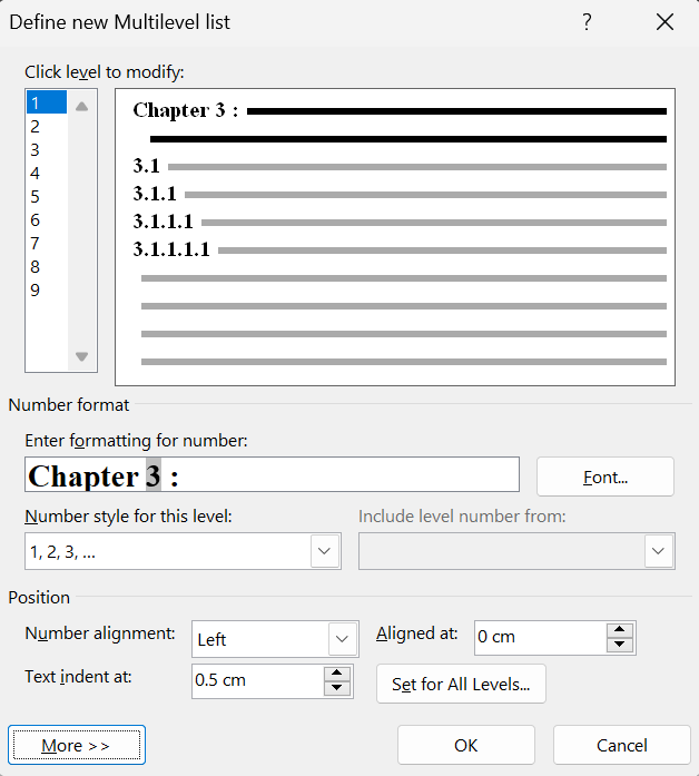 - Define New Multilevel List Settings: Shows my predefined multilevel list setup.
