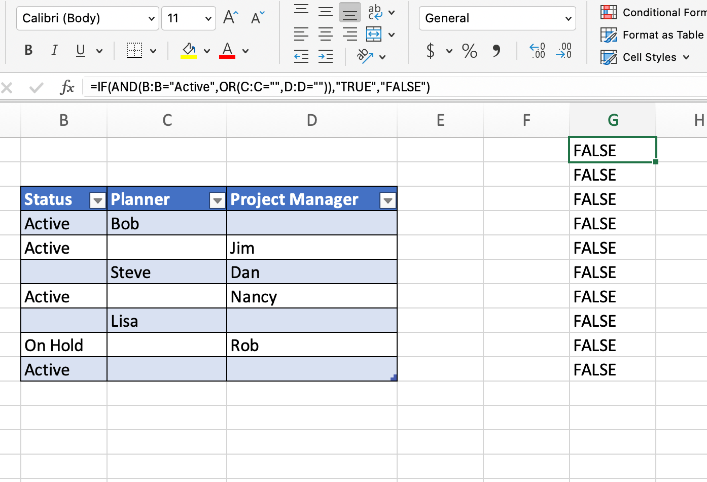 Right now the formula is returning back each row as "FALSE" but based on the sample data I have I know that Rows 4, 5, 7, and 10 should have "TRUE" displayed because the status of column B is "Active" and at least one of Columns C and D (or both) are blank for all those rows.