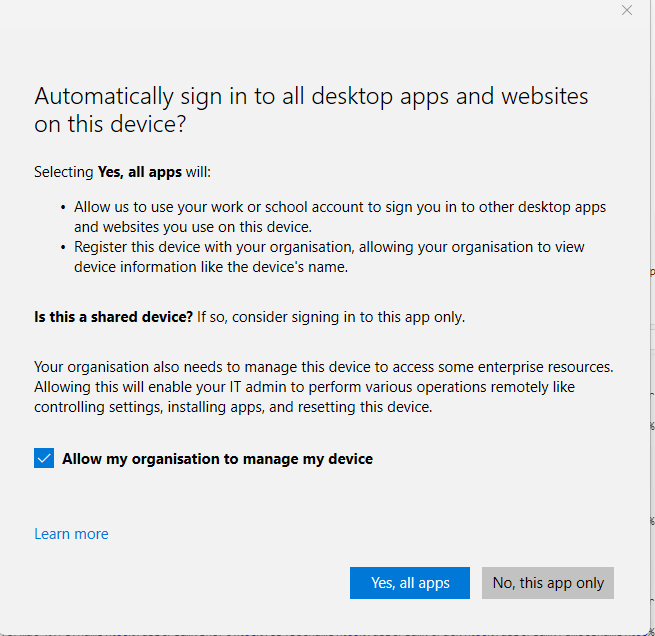 If you uncheck this and tap OK, your device will stay under your full control, and administrators won’t be able to manage or enforce policies on it remotely. - No, sign in to this app only