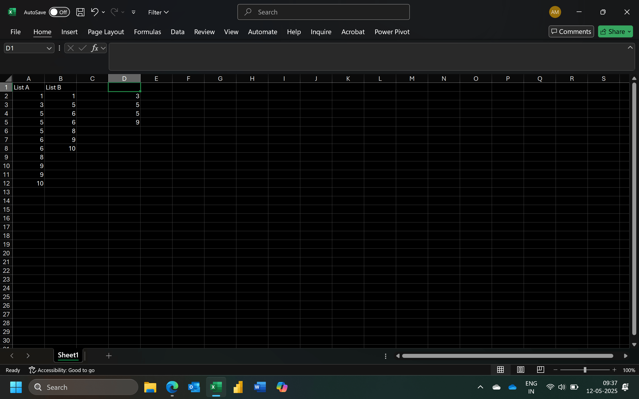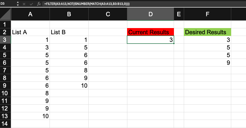 I would like to figure out how to use the filter [removed_js] to find items that are in one list but not in another list. The catch is that this function has to be able to detect items that show up in one list 2 or 3 times but only show up once or twice in the other list. For example, if list A has the numbers 1, 3, 5, 5, 5, 6, 6, 8, 9, 9, 10 and list B has the numbers 1, 5, 6, 6, 8, 9, 10, I need the filter function to return the list 3, 5, 5, 9. This will be used to filter out items that should not be showing up in one list or are showing up too many times in one list so I can reconcile the two lists quicker. The function I am currently using is =FILTER(A1:A2000,NOT(ISNUMBER(MATCH(A1:A2000,B1:B2000,0)))). This does a good job of showing my items in list A that do not appear in list B, but unfortunately does not show me items that show up 4 or 5 times in list A so long as it shows up even once in list B. Any ideas how to resolve this?