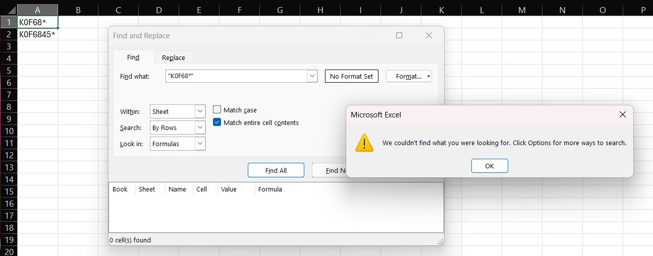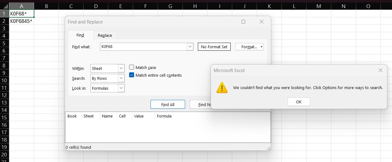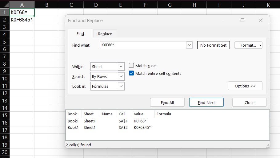 We understand the frustration you're experiencing when finding exact text within Excel. To search for an exact match without removing or changing the asterisk, please try the following steps to search for K0F68* exactly:
