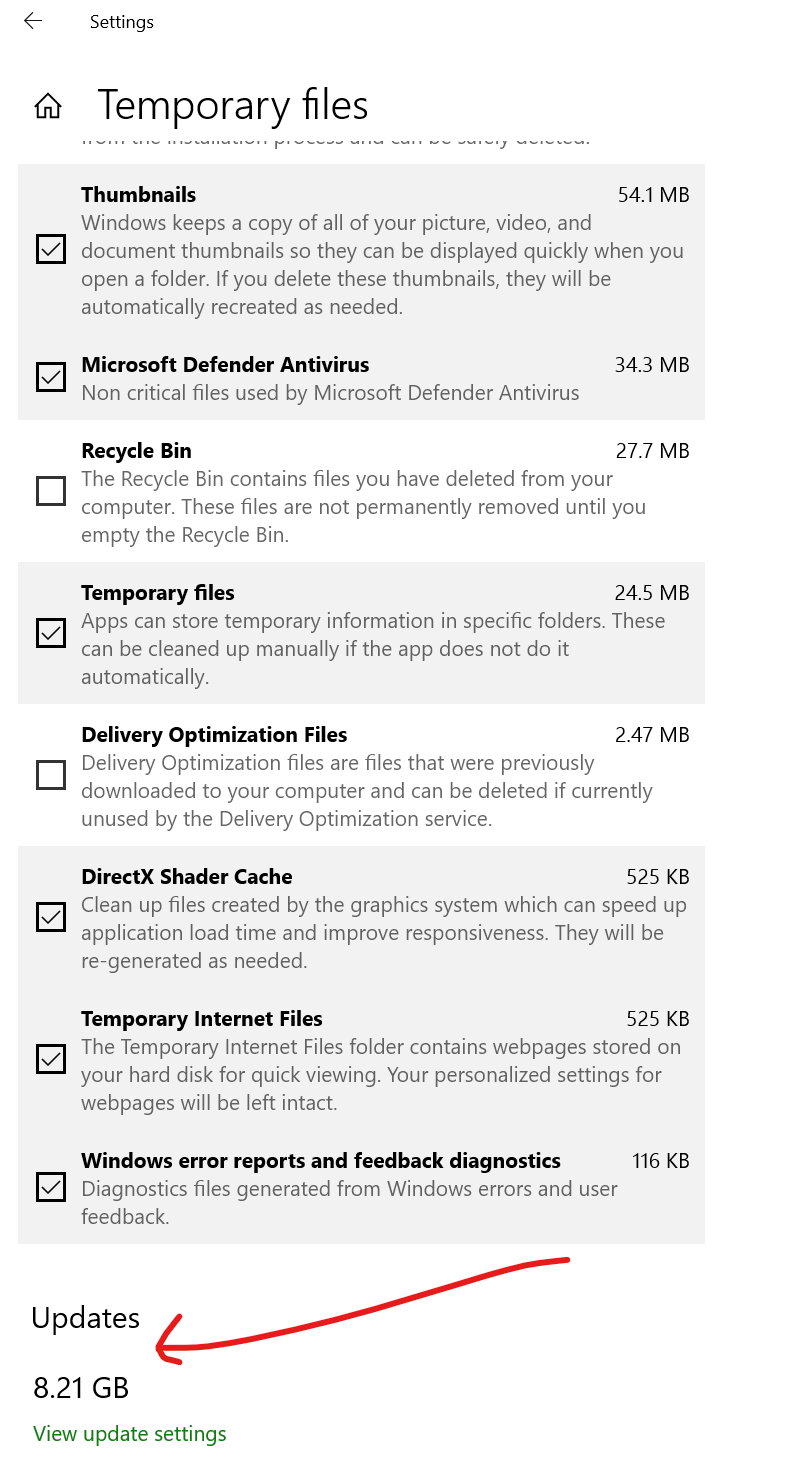 - In the list, check Windows Update Cleanup (this is the part that hides in “Updates > Temporary Files”).