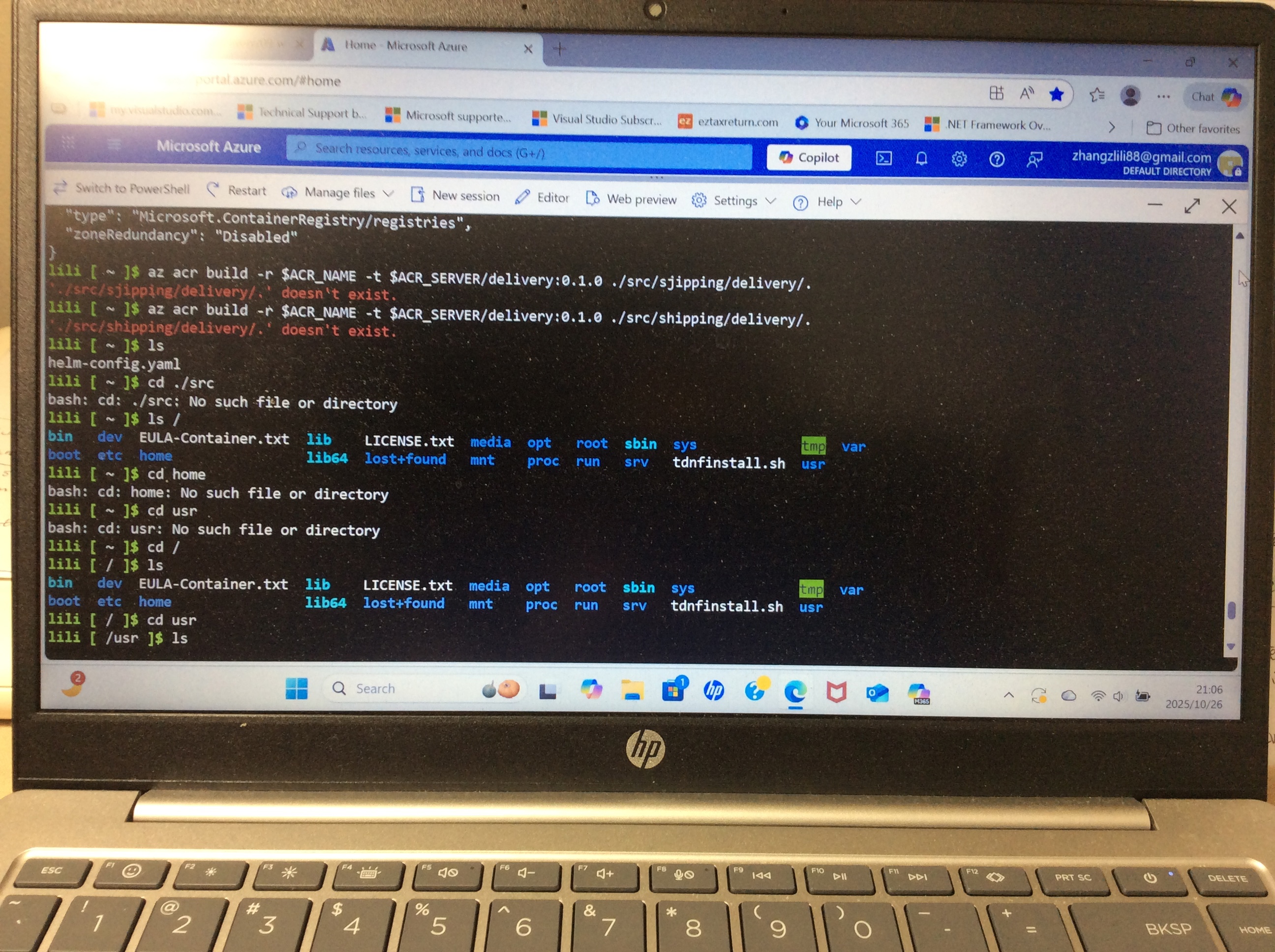 The message "./src/shipping/delivery/. does not exist" means the Azure CLI can't locate the build context path when pushing your Dockerfile and source to ACR. In az acr build, the final argument specifies the local directory to use as the build root (containing the Dockerfile and app files)—it resolves relative to your current shell location. If you're running the command from the repo's root (e.g., /path/to/aks-fabrikam-dronedelivery), ./src/shipping/delivery/. should point to the delivery service's folder, but the trailing "." might confuse the parser or indicate a deeper issue like: