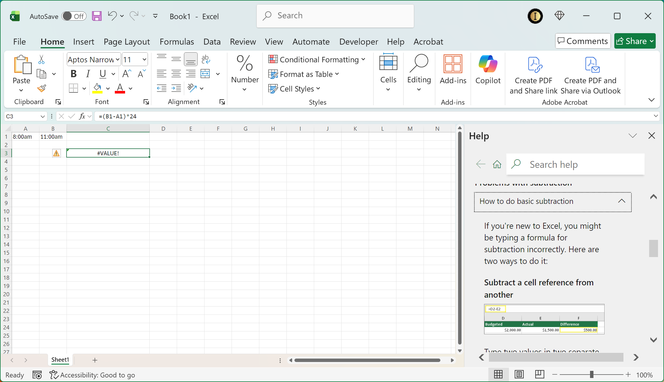 This issue often happens if one of the cells in your time formula isn’t in the correct time or number format. Try setting the cell format to Time or General, then check your formula (for example, =B2-A2).