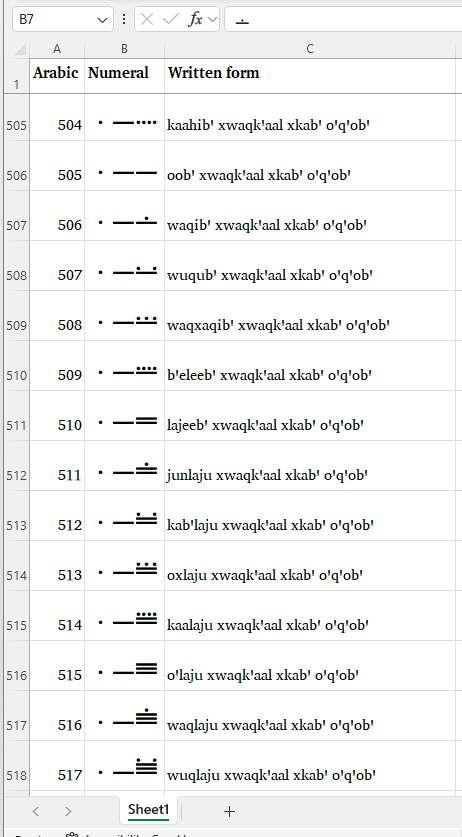 Also, here is a screen snip of my my Excel list of the numerals and words 1 - 1200. Mayan numerals screenshot.png Column B is the numeral, Column C is the word written out, Column A is the corresponding Arabic numeral.