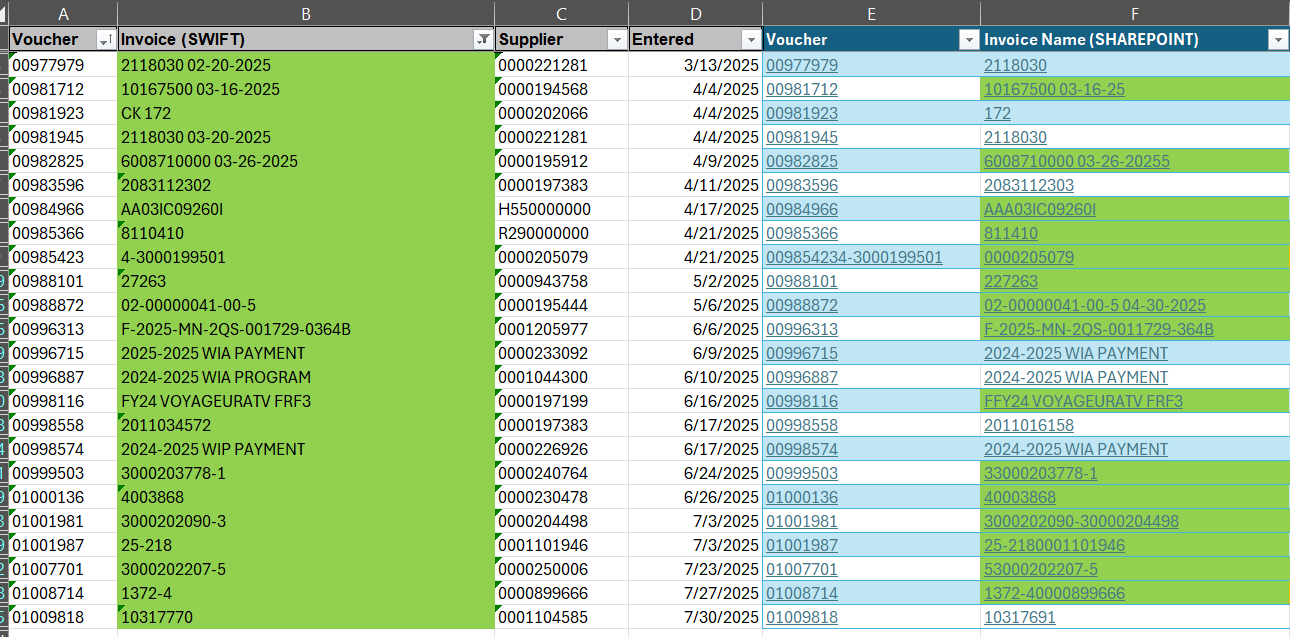 To fix this, highlight values in B that do not exist in F (or vice-versa):