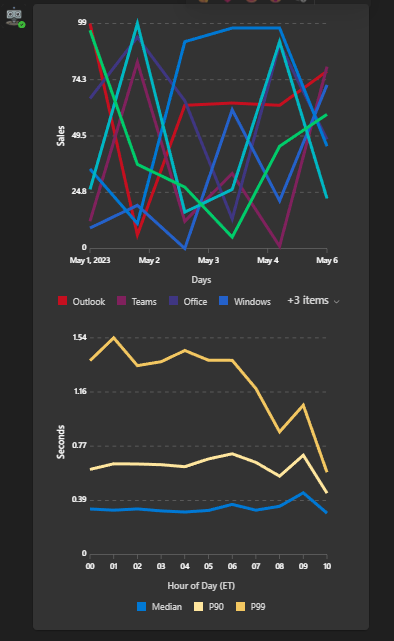 The Adaptive Card JSON is here: I placed both the line graph I wanted and the line graph example in the adaptive card. Both display on the Teams Web client and in the Teams Desktop client. But only the sample Line graph displays on the iPhone.