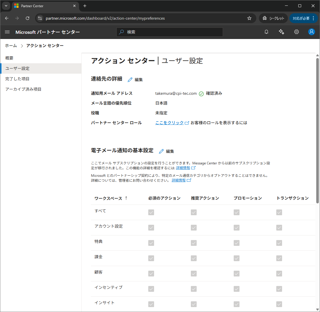 連絡用メールは Partner Center「アクション センター|ユーザー設定」で常用アドレスに変更し、OTP で確認済みです(添付User_setting.png)。