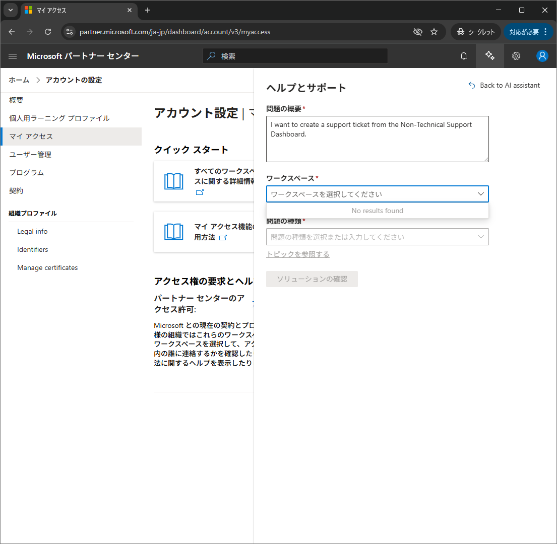 - Partner Center の「Help + support」で “Workspace: No results found” になり、チケット作成不可(添付No_resulta_found.png)