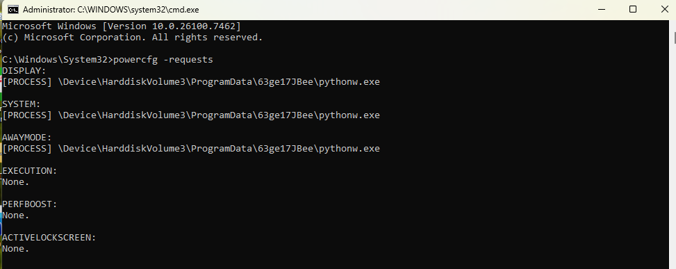 The Power Issue: This process is actively making a "Power Request" to keep your display on. This is often done by malicious background processes to ensure they aren't interrupted or to simulate user activity.