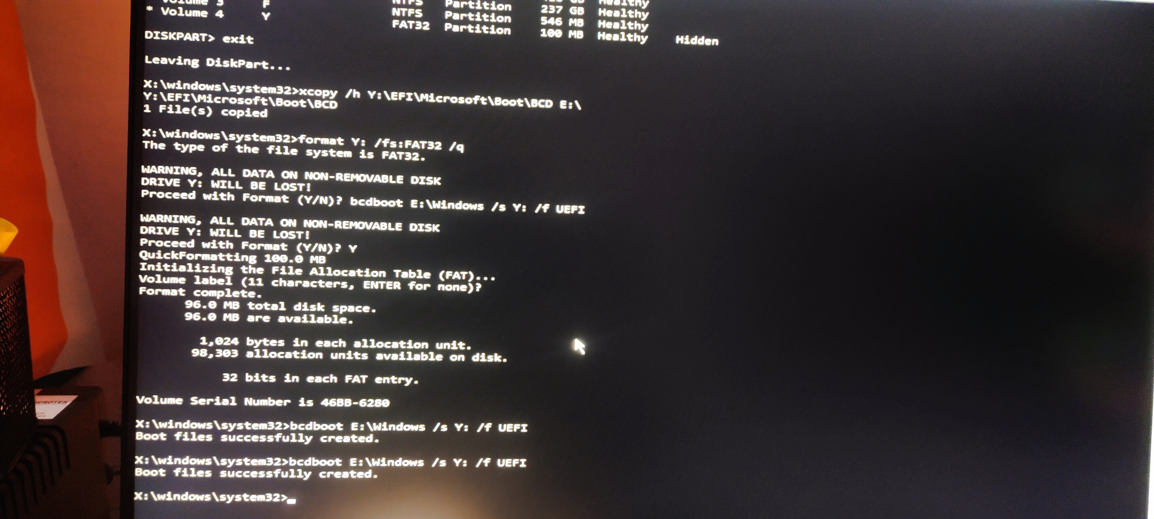 xcopy /h Y:\EFI\Microsoft\Boot\BCD E:\