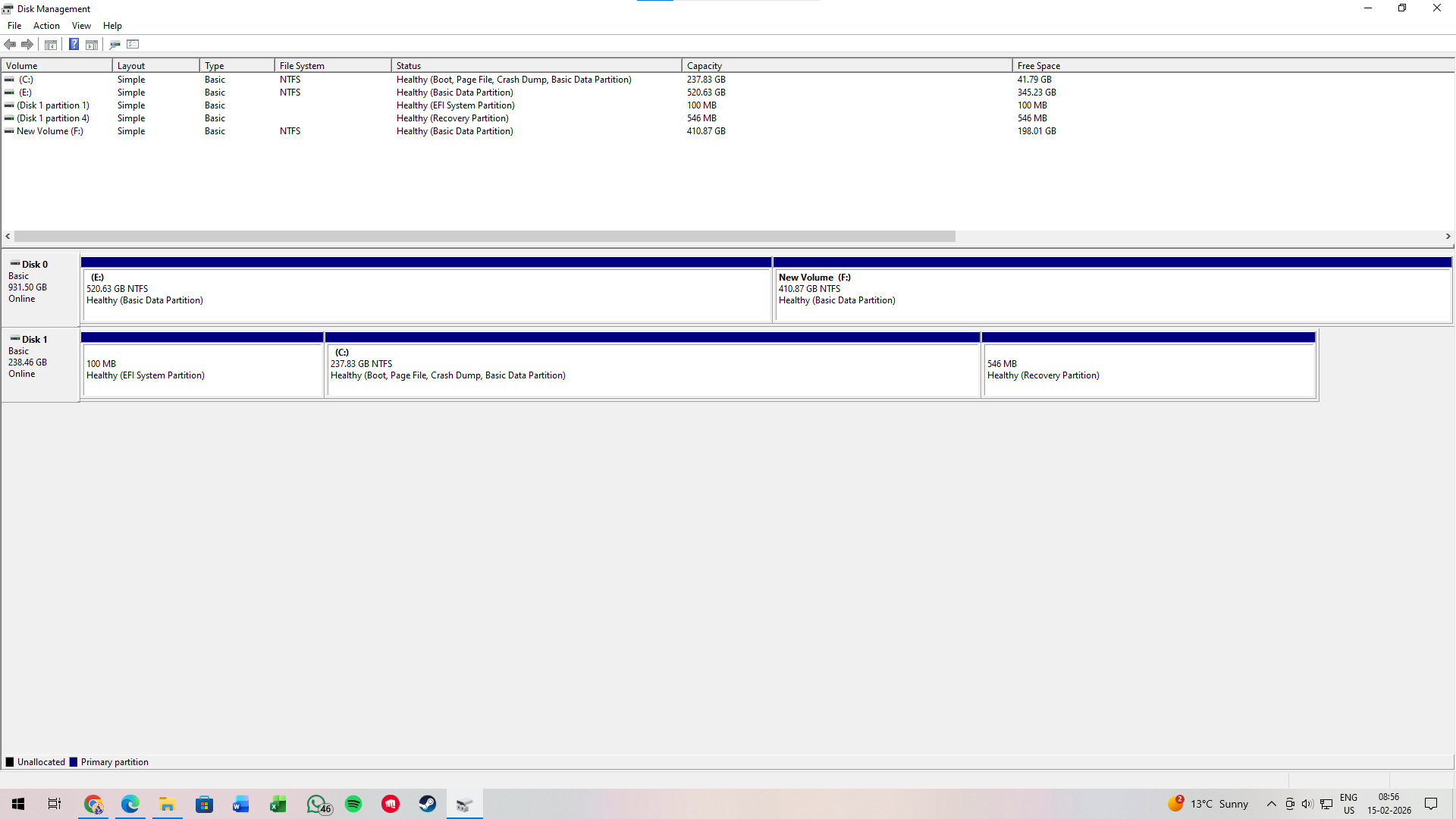 Right-click Start, and click Disk Management. Maximize Disk Management, adjust the column widths in the top pane to make all the entries visible. Post a screenshot.