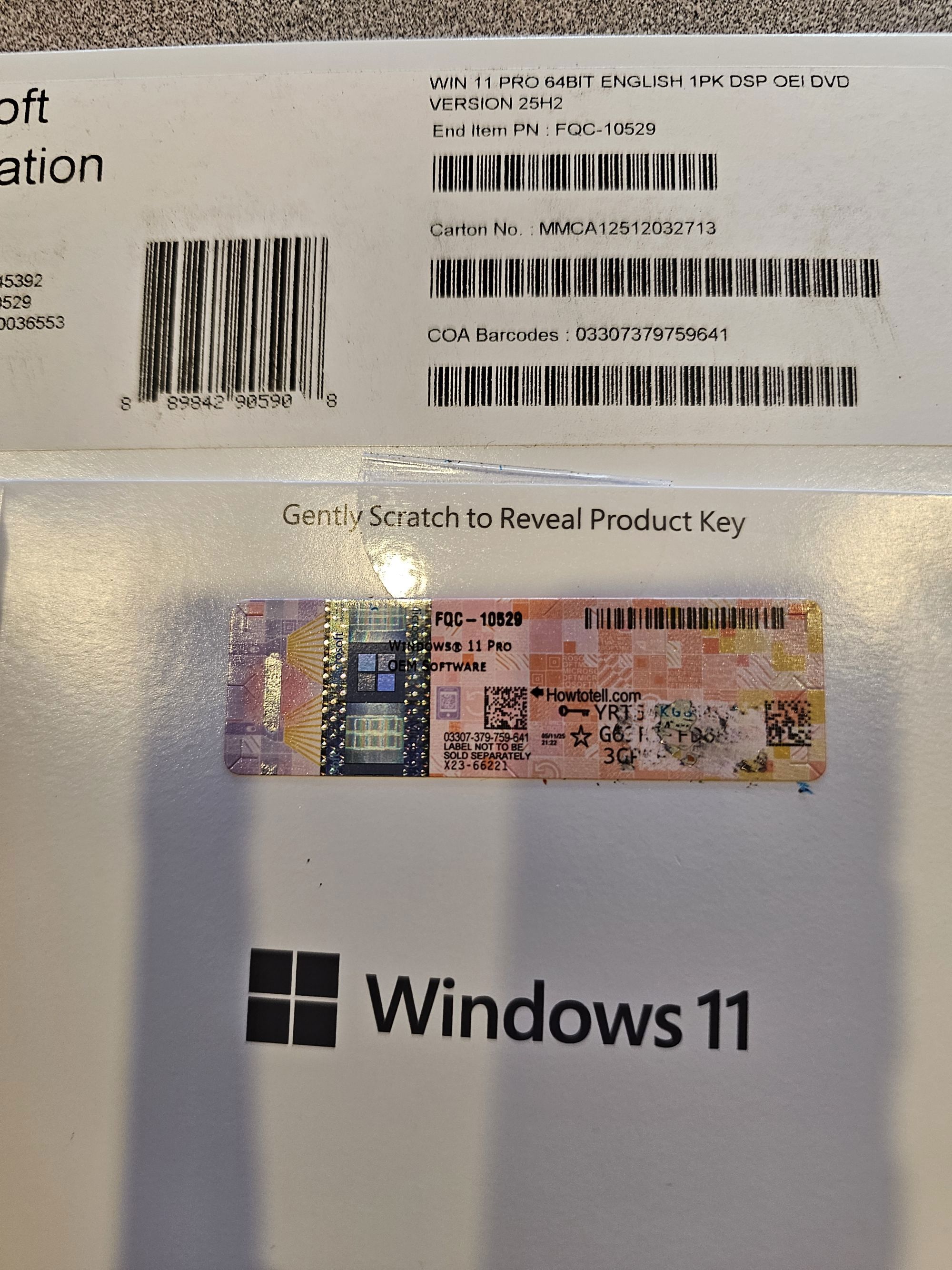 I destroyed the Product Key on my Win 11 Pro DVD while "gently" scratching it off. Need a replacement to Activate my Win 11 install. Bought the DVD from Amazon. Attached are pictures of the Dvd and a screenshot of the purchase.