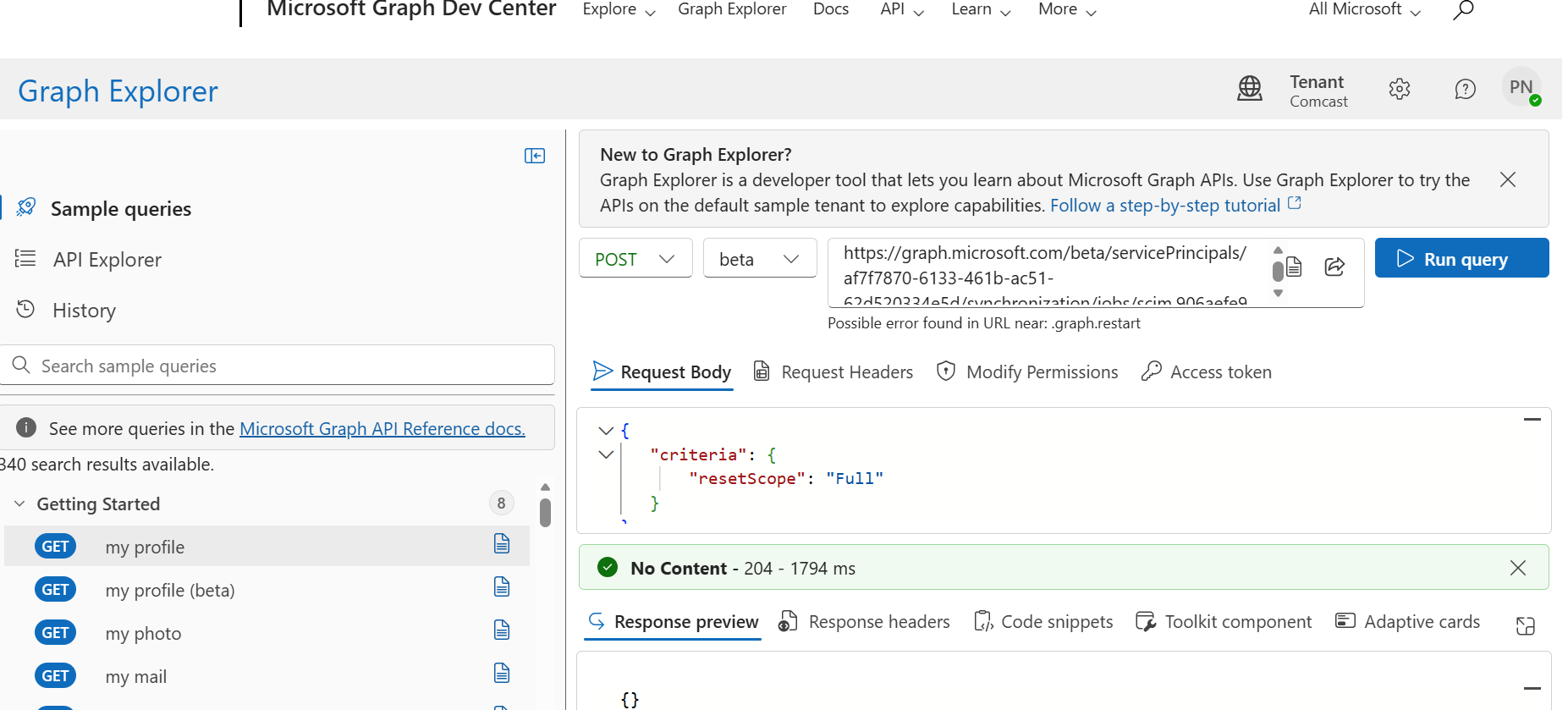 Entra is trying to provision the accounts as new, rather than acknowledge them as existing. IE its sending POST messages because it doesn't believe, or hasn't properly synced the existing Slack userID into the Entra datastore. We need to force Entra to restart the synchronization job: https://learn.microsoft.com/en-us/graph/api/synchronization-synchronizationjob-restart?view=graph-rest-beta&tabs=http To note, This needs to be done using the BETA branch - no idea why it doesn't work on 1.0, but we have reports from other customers that have to do this, that it doesnt work otherwise. additionally, you need to change the criteria to the following: