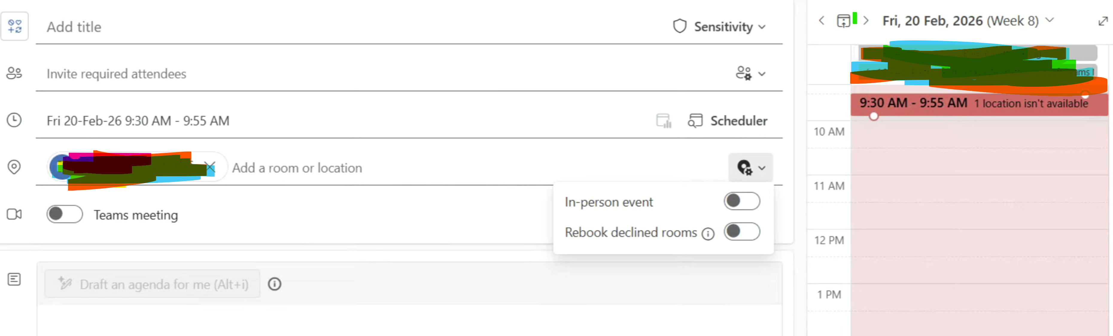 Open Scheduling Assistant (next to the time field) and review the room’s availability.