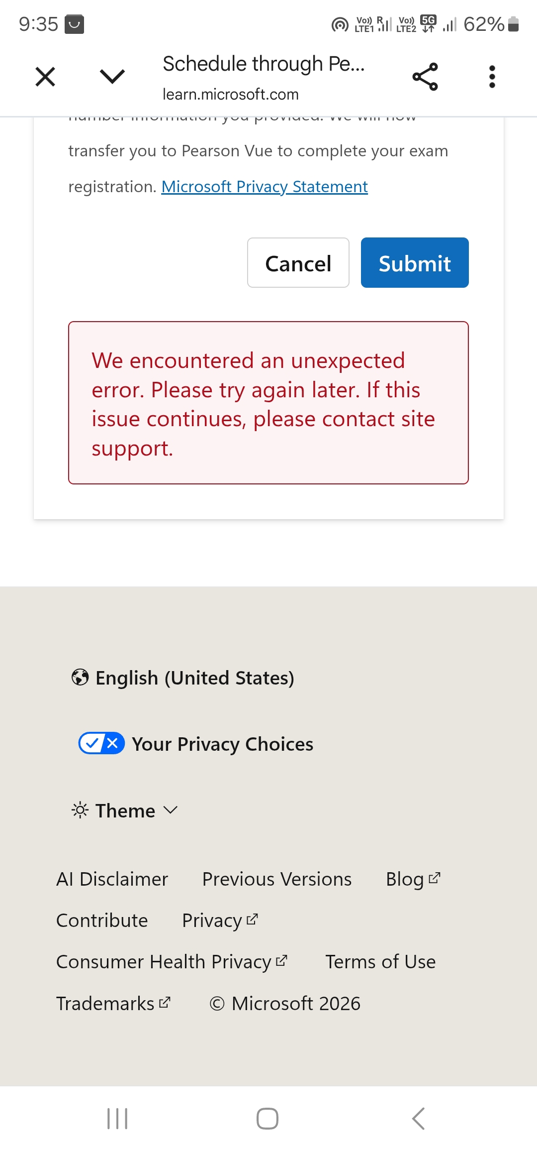 I'm getting a continuous error message when trying to register for the PL-900 exam. I've tried calling both Microsoft and Pearson, but there’s been no solution yet. Any help would be appreciated. Thanks.Screenshot_20260308_213535_Chrome.jpg