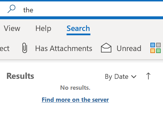However, on the Surface Pro, the search function in Outlook stopped working somewhere in July. When I do a search, I simply get 'no results' and below that 'find more on server'. When I click the latter, again: 'no results'.