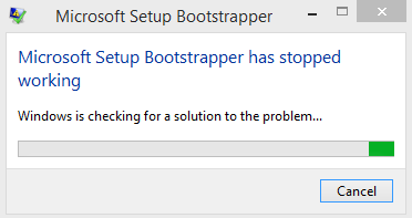 I had an office 2013 installation before, I uninstalled it for a certain reason, I downloaded another Office 2013 Professional Plus with SP1 from my MSDN Subscription, when I try to install it, during the installation, I get a message saying "*Office has encountered an error during setup" ,*When I click on close I receive another dialog saying *"Microsoft setup bootsrap has stopped working"*I tried many solutions I could find on the internet like deleting registry keys and so on, but the problem wasn't resolved. Here are some screen shots :
